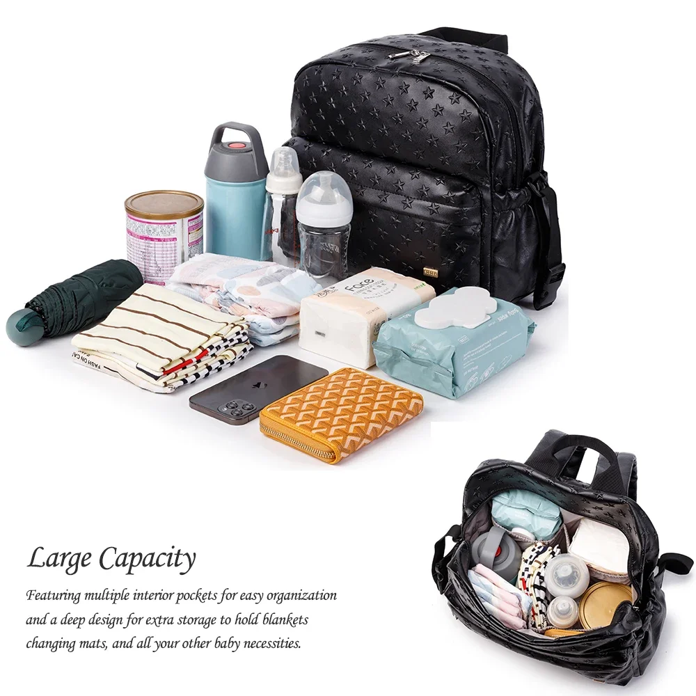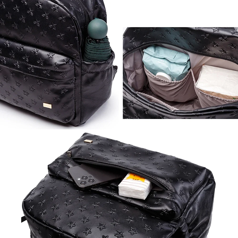 Chaque détail du sac à langer imperméable en PU avec motif étoile – Idéal pour les mamans en déplacement a été pensé pour faciliter la vie des mamans. Les poches et compartiments astucieusement disposés assurent un accès facile à tout le nécessaire de votre bébé à tout moment.